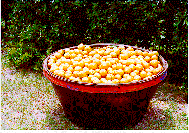 A full tub of Valencia oranges ready for pickup by the goat
